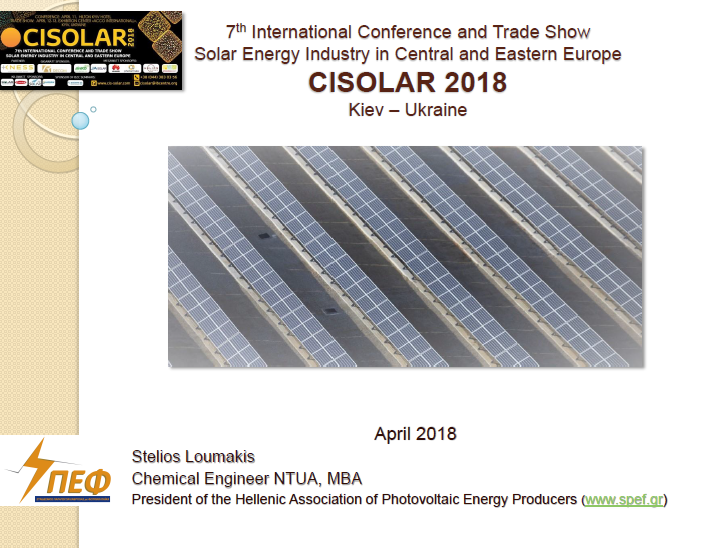 Στην παράθεση αναλυτικών στατιστικών στοιχείων, εμπειριών αλλά και των κομβικών εξελίξεων που έχουν δρομολογηθεί στην αγορά ηλεκτρικής ενέργειας από φωτοβολταϊκά και εν γένει ΑΠΕ τα τελευταία χρόνια στην Ελλάδα προχώρησε ο Πρόεδρος του ΣΠΕΦ Στέλιος Λουμάκης στην παρουσίαση του ως προσκεκλημένος ομιλητής στο Διεθνές Συνέδριο CISOLAR 2018 στο Κίεβο της Ουκρανίας την Τετάρτη 11 Απριλίου 2018. Στο συνέδριο πέραν των κυβερνητικών και θεσμικών παραγόντων της αγοράς ηλεκτρικής ενέργειας της Ουκρανίας, συμμετείχαν δεκάδες ομιλητές εκπρόσωποι του χώρου των φωτοβολταϊκών από μια σειρά χώρες της Κεντρικής-Ανατολικής Ευρώπης, της Μ. Ανατολής αλλά και της Ασίας όπως Πολωνία, Σλοβενία, Λιθουανία, Εσθονία, Λευκορωσία, Ιορδανία, Καζακστάν, Τουρκία, Αίγυπτος, Ινδία και Σιγκαπούρη, ενώ το παρόν επίσης έδωσαν εκπρόσωποι κορυφαίων εταιριών παραγωγής φωτοβολταϊκού εξοπλισμού και ηλεκτρολογικού υλικού, αφού το συνέδριο ακολουθεί διήμερη διεθνής σχετική έκθεση.