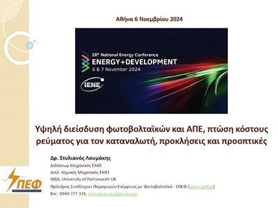 Στην ραγδαία πτώση του μέσου κόστους ηλεκτρικής ενέργειας από ΑΠΕ για τους καταναλωτές στη χώρα μας αναφέρθηκε στην ομιλία του από το βήμα του 28ου Εθνικού Συνεδρίου «Ενέργεια και Ανάπτυξη» του Ινστιτούτου Ενέργειας Νοτιανατολικής Ευρώπης (ΙΕΝΕ), που διεξήχθη στην Αθήνα στις 6 Νοεμβρίου 2024, ο Πρόεδρος του ΣΠΕΦ Δρ. Στέλιος Λουμάκης παρουσιάζοντας σχετική τεχνική του ανάλυση. Επιγραμματικά: