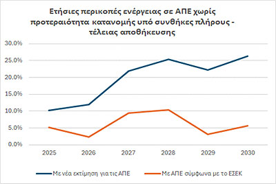 · Στις ΑΠΕ δρομολογούνται συνθήκες συστημικής υπερδυναμικότητας ως προς την τελική ζήτηση ηλεκτρικής ενέργειας σε ετήσια βάση. Αυτό αφορά και τα προγράμματα αυτοπαραγωγής. Το πρόβλημα δεν μπορεί να θεραπευτεί από την αποθήκευση ή τα δίκτυα. Η αποθήκευση μόνο ετεροχρονίζει (μεταφέρει) την έγχυση της παραγωγής σε άλλες ώρες αλλά δεν αυξάνει την ετήσια κατανάλωση. Τα δίκτυα μόνο μεταφέρουν την ενέργεια σε διαφορετική τοποθεσία για κατανάλωση, εφόσον υπάρχει ζήτηση. Εν προκειμένω, σε όρους ενέργειας ετησίως αναμένονται περικοπές τουλάχιστον 25% στα ανανεώσιμα έργα που δεν έχουν προτεραιότητα κατανομής, εφόσον υλοποιηθούν οι στόχοι του ΕΣΕΚ με ταυτόχρονη, ως φαίνεται, υπέρβαση στην εγκατεστημένη ισχύ των φωτοβολταϊκών στα 19 GW αντί 13,5 GW το 2030.