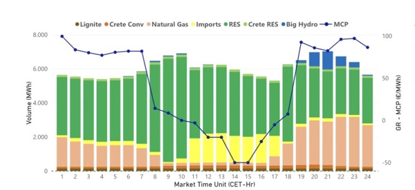 Την 1/5/25 εμφανίζονται πλέον αρνητικές τιμές μεγάλου εύρους και στην ελληνική προημερήσια αγορά που φθάνουν σε κάποιες χρονομονάδες τα -50 ευρώ/MWh. Εν προκειμένω από τις 11.00 πμ έως τις 17.00 μμ το σύστημα θα έχει συνεχόμενα αρνητική τιμή. Όπως έχουμε πολλάκις γράψει, το φαινόμενο των αρνητικών τιμών υφίσταται από χρόνια συστηματικά στην Ευρώπη και τώρα ένεκα της υπερδυναμικότητας των ΑΠΕ και ιδίως των Φ/Β στην χώρα μας, εμφανίζεται και στην Ελλάδα.