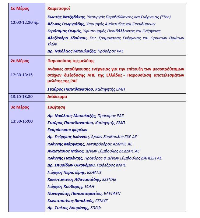 Με παρούσα σύσσωμη την πολιτική ηγεσία του Υπουργείου Ενέργειας και τον Υπουργό Ανάπτυξης θα λάβει χώρα την Παρασκευή 15 Μαίου διαδικτυακή ημερίδα της ΡΑΕ με θέμα την αποθήκευση ηλεκτρικής ενέργειας, όπου και θα παρουσιαστεί ειδική μελέτη που εκπονήθηκε για λογαριασμό της από το ΕΜΠ. Η ημερίδα αποτελεί πρωτοβουλία της Αρχής στα πλαίσια των αρμοδιοτήτων της για την έγκυρη και υπεύθυνη ενημέρωση της ενεργειακής αγοράς.