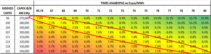 Γενικότερα στον πίνακα αποτελεσμάτων της μελέτης του ΣΠΕΦ που κατ’ αποκλειστικότητα παρουσιάζει το energypress, η διαγώνια κίτρινη ζώνη είναι αυτή που για τα αυξανόμενα κάθε φορά κόστη CAPEX εξασφαλίζει με ανάλογα αυξημένες Τιμές Αναφοράς σε σχέση με τα τρέχοντα επίπεδα, project IRR πέριξ του 7.5%.