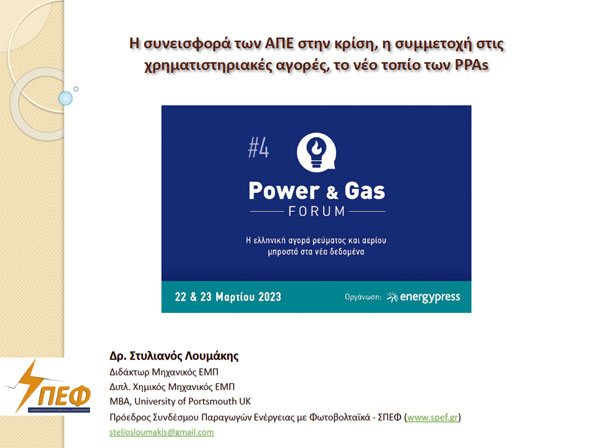 Την οικονομική συνεισφορά των ΑΠΕ αλλά και ανά επιμέρους τεχνολογία τους στην ενίσχυση των καταναλωτών κατά την διάρκεια τις ενεργειακής κρίσης ανέδειξε από το βήμα του συνεδρίου Power and Gas με ποσοτική του ανάλυση ο Πρόεδρος του ΣΠΕΦ Δρ. Στέλιος Λουμάκης την Πέμπτη 23 Μαρτίου. Επιπλέον αναφέρθηκε στις προκλήσεις που απορρέουν από τον νέο χάρτη πολιτικών και προτεραιοτήτων που πρόσφατα κοινοποίησε η Ευρωπαϊκή Ένωση.