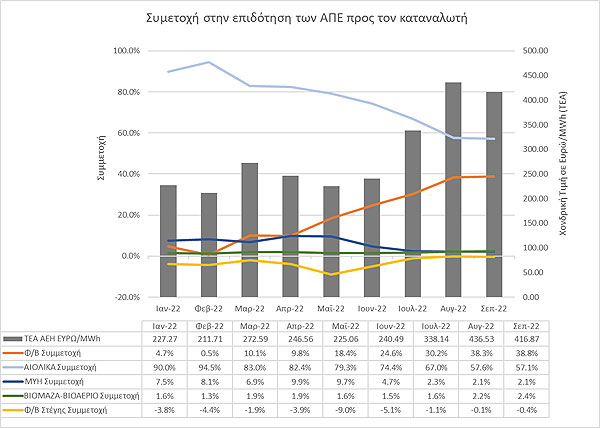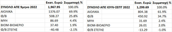 Σε σωρευτικό επίπεδο τα φωτοβολταϊκά στο α΄9μηνο του 2022 που υπάρχουν διαθέσιμα πρωτογενή στοιχεία από το τελευταίο δελτίο ΕΛΑΠΕ του ΔΑΠΕΕΠ αλλά και στο 4μηνο Ιουν-Σεπτ της κορύφωσης της κρίσης, κάλυψαν το 26% και 35% αντίστοιχα του απευθείας ποσού. Η κρίση λοιπόν αύξησε σημαντικά τη θετική συνεισφορά τους, συμπληρωματικά και προς την αυξημένη τους διείσδυση με νέα ιδιαιτέρως φθηνά σε τιμές αναφοράς έργα που ηλεκτρίστηκαν εντός της χρονιάς.